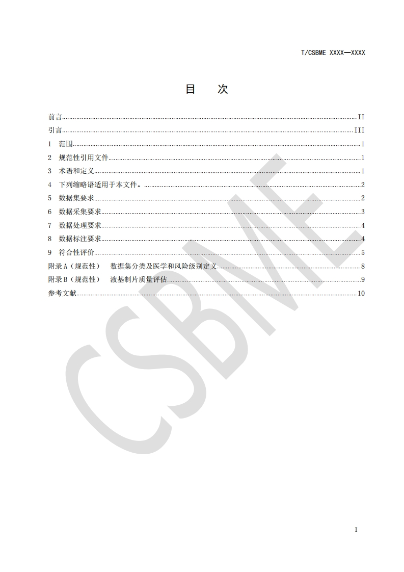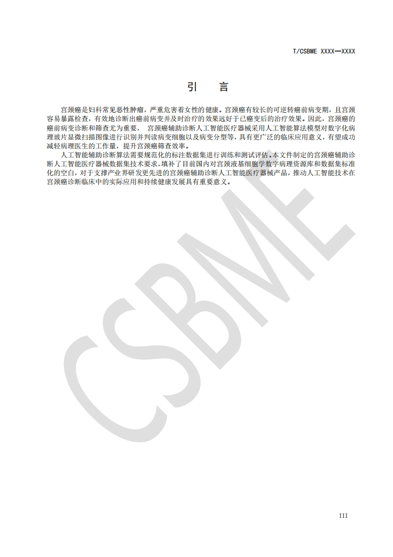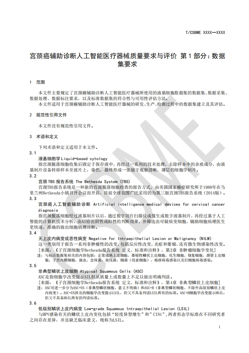 ICS点击此处添加ICS号CCS点击此处添加cCS号团体标准T/CSBME XXXX-XXXX宫颈癌辅助诊断人工智能医疗器械质量要求与评价第1部分:数据集要求Artificial intelligence medical devices for cervical cancer diagnosis-Qualityrequirements and evaluation-Part 1:Technical requirements for datasets(征求意见稿)在提交反馈意见时,请将您知道的相关专利连同支持性文件一并附上。XXXX-Xx-XX发布XXXX-Xx-XX实施中国生物医学工程学会发布