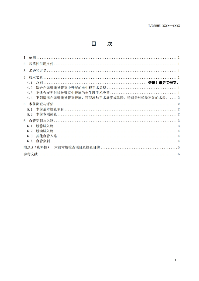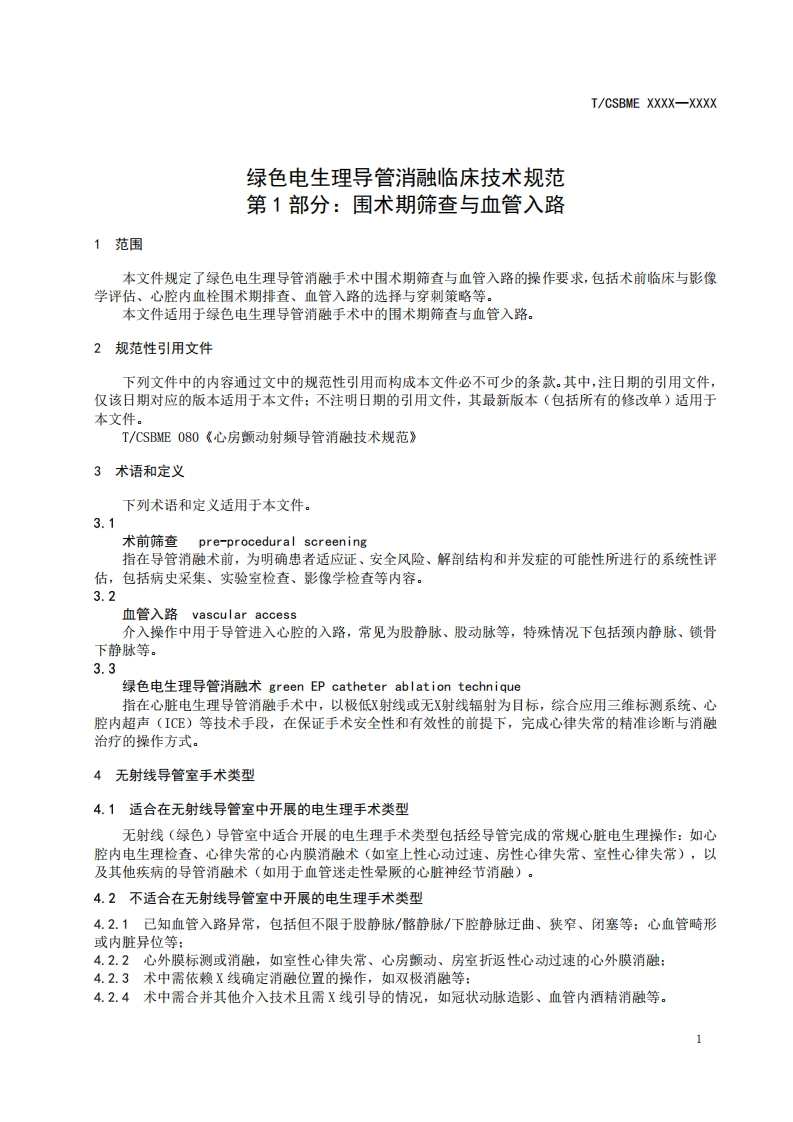 ICS点击此处添加ICS号CCS点击此处添加CCS号T团体标准T/CSBME XXXX-XXXX绿色电生理导管消融临床技术规范第1部分:围术期筛查与血管入路Clinical technical standards for green EP catheter ablationPart 1:Periprocedural Screening and Vascular Access征求意见稿在提交反馈意见时,请将您知道的相关专利连同支持性文件一并附上。XXXX-Xx-XX发布XXXX-Xx-XX实施中国生物医学工程学会发布
