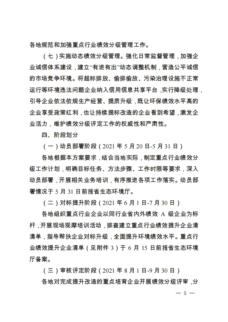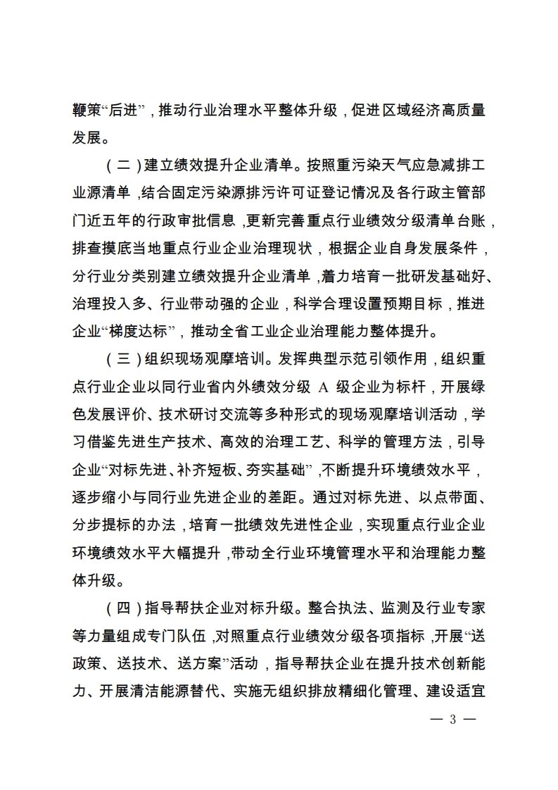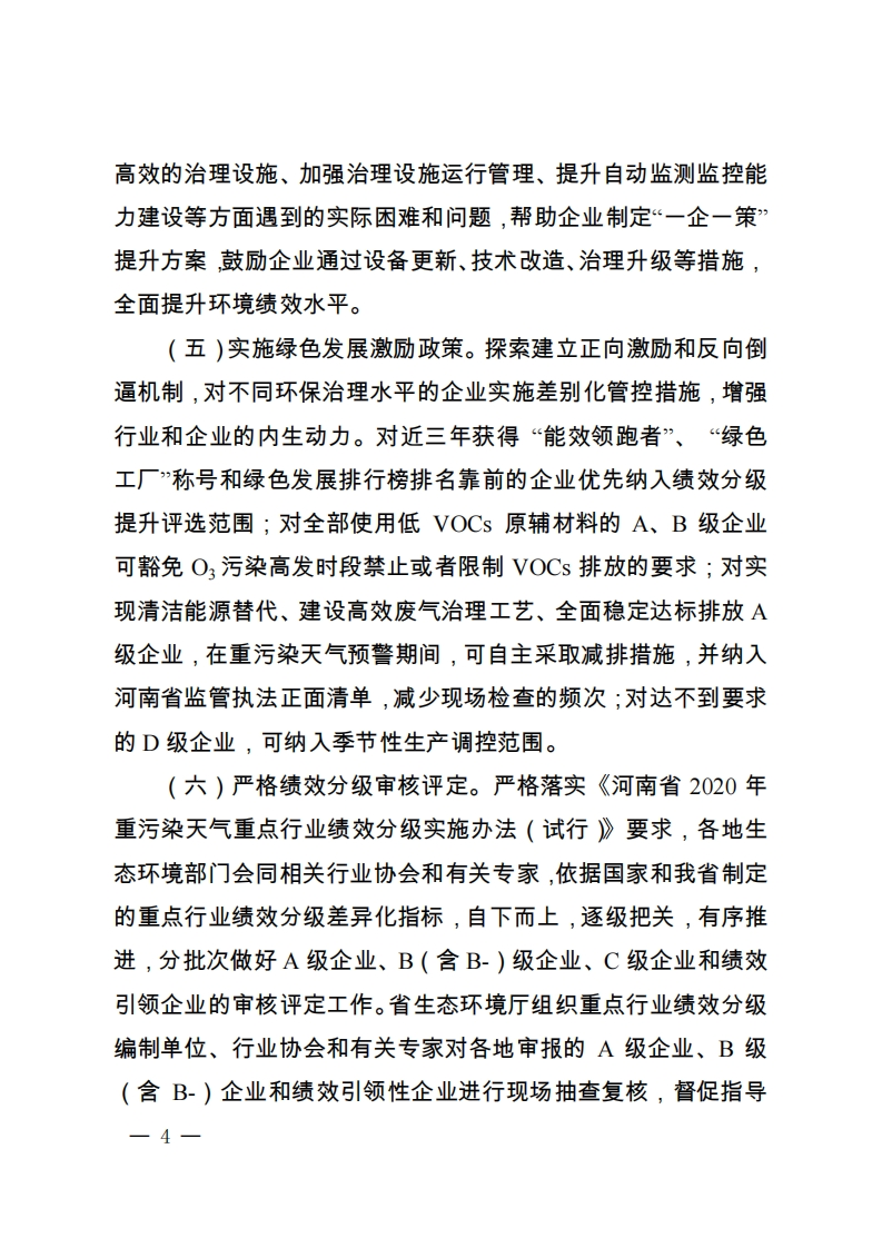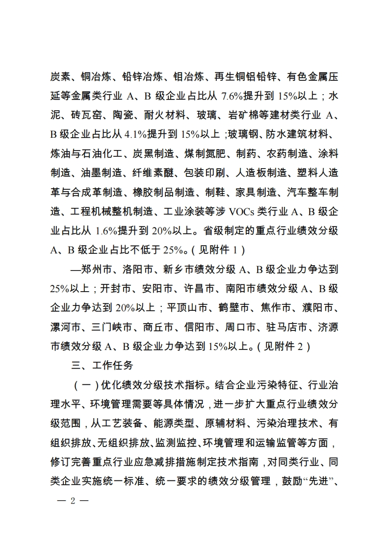 河南省2021年重点行业绩效分级提升行动方案为深入贯彻落实《河南省2021年大气污染防治攻坚实施方案》要求,进一步规范和加强重点行业绩效分级管理工作,全面提升工业企业环境治理水平,推动环境空气质量持续改善,制定本方案。一、总体要求深入学习贯彻习近平生态文明思想,牢固树立绿色发展理念,全面落实党中央、国务院和省委省政府关于深入打好污染防治攻坚战的决策部署,以深化重点行业大气污染综合治理,推动工业企业绿色发展为立足点,坚持源头治理、系统治理、综合治理,进一步规范和加强重点行业绩效分级管理,科学分析,精心比选全程优化,有序推进,指导帮扶企业瞄准省内外行业先进典型开展对标升级,大力推进科技创新和技术进步,引导企业加快节能、降耗、减污、降碳等绿色转型发展,不断提升环境治理能力和治理水平,促进区域经济高质量发展,持续有效推进环境空气质量不断改善。二、工作目标到2021年底,全省重点行业绩效分级A、B级企业和绩效引领性企业力争不低于20%,全省范围内基本消除D级企业,重点行业绩效分级管理水平大幅提升。一钢铁、铁合金、焦化、石灰窑、铸造、氧化铝、电解铝、