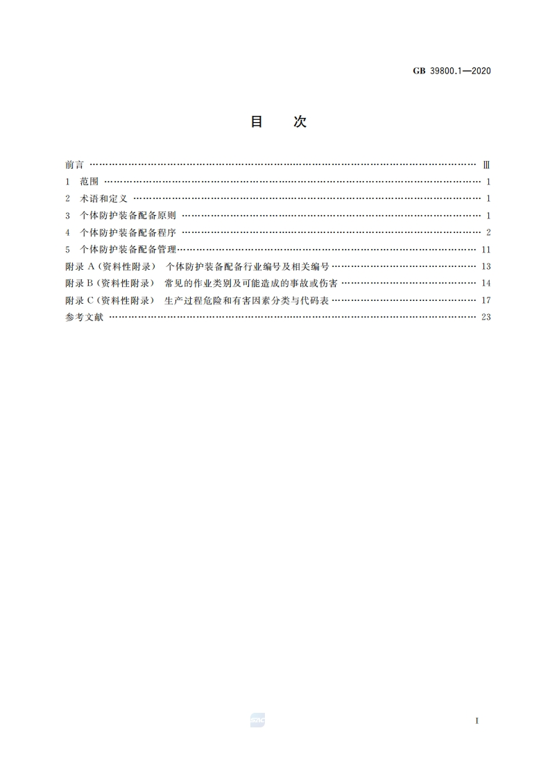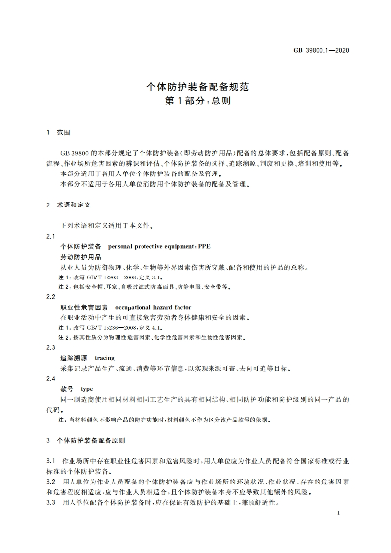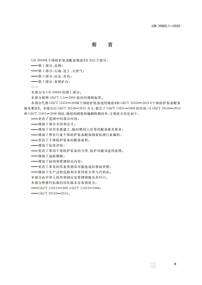 1CS13.340.01C73GB中华人民共和国国家标准GB39800.1-2020代替GB/T11651一2008,GB/T29510一2013四个体防护装备配备规范第1部分:总则Specification for the provision of personal protective equipment-Part 1:General requirement2020-12-24发布2022-01-01实施国家市场监督管理总局发布国家标准化管理委员会