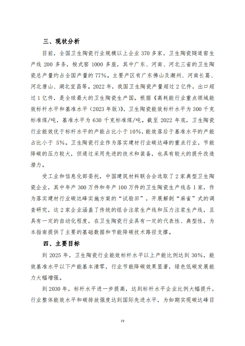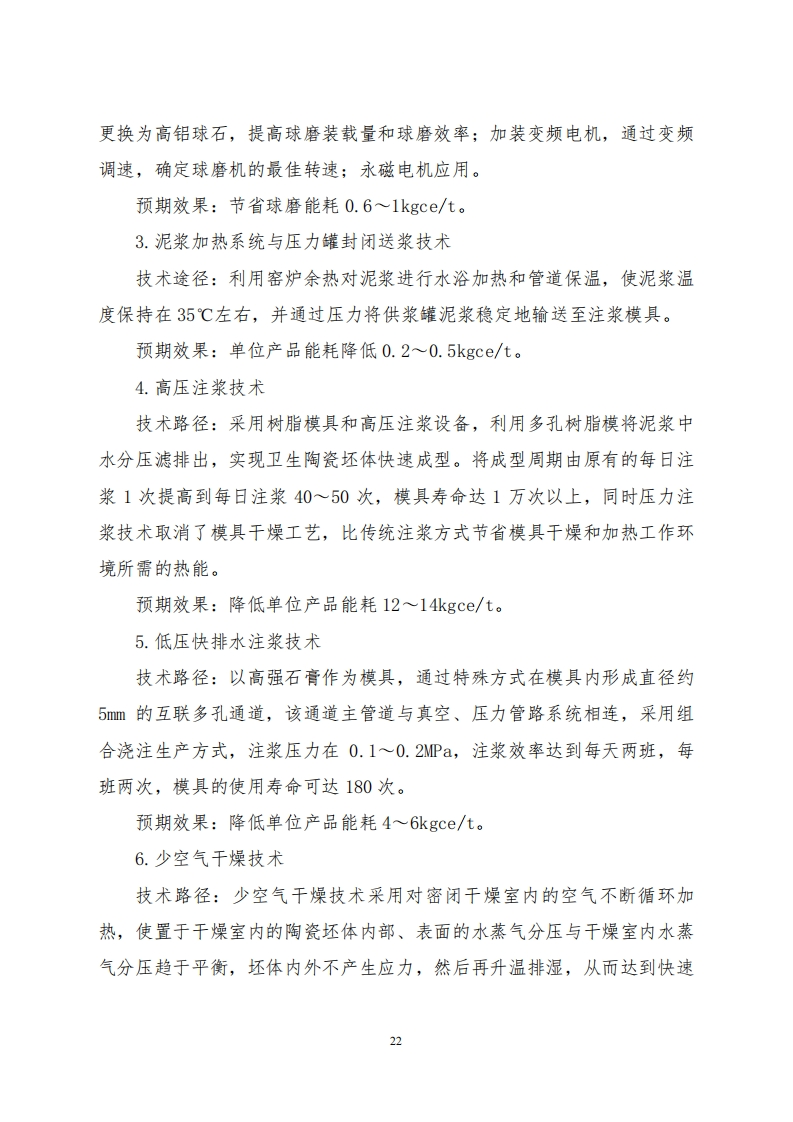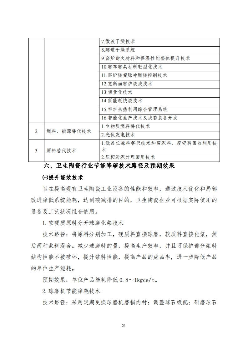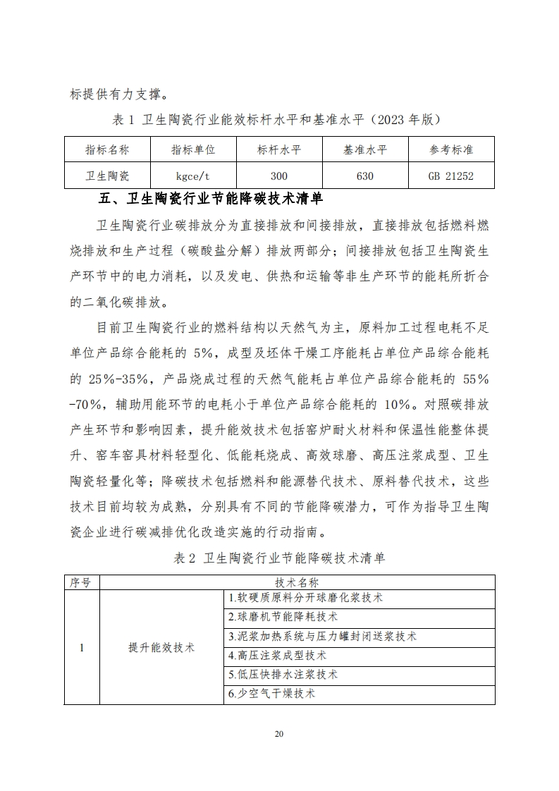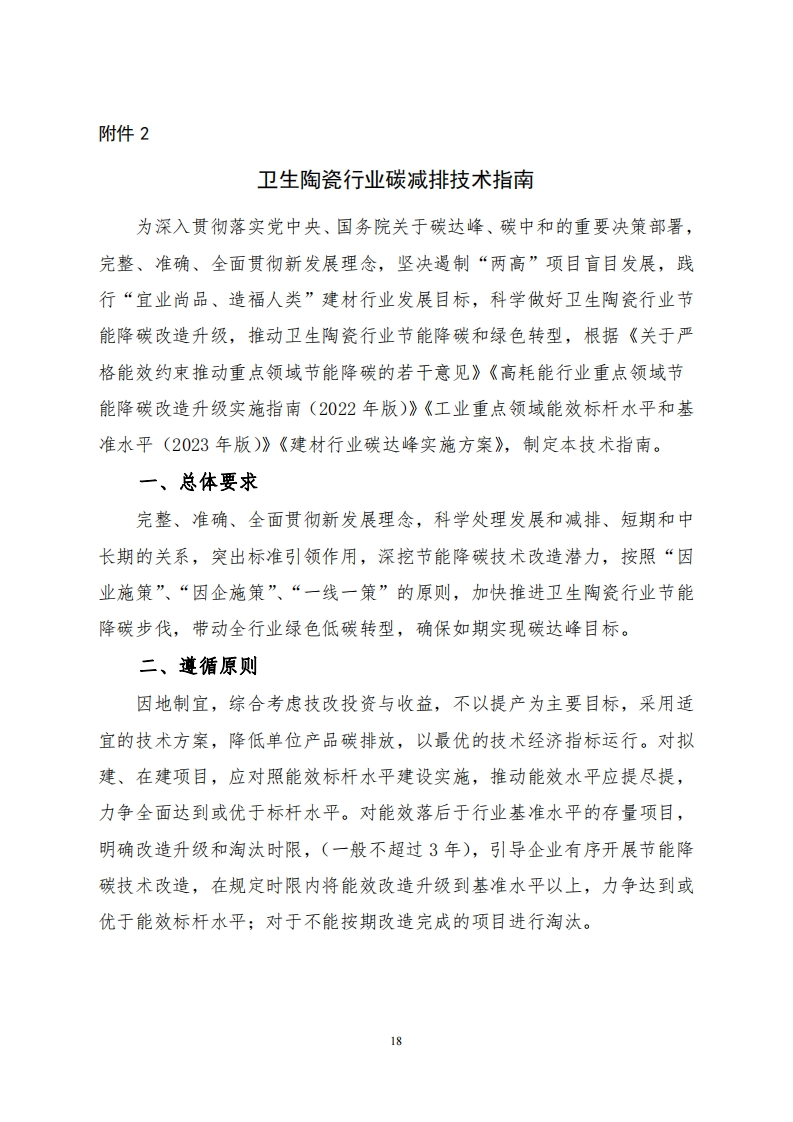附件2卫生陶瓷行业碳减排技术指南为深入贯彻落实党中央、国务院关于碳达峰、碳中和的重要决策部署,完整、准确、全面贯彻新发展理念,坚决遏制“两高”项目盲目发展,践行“宜业尚品、造福人类”建材行业发展目标,科学做好卫生陶瓷行业节能降碳改造升级,推动卫生陶瓷行业节能降碳和绿色转型,根据《关于严格能效约束推动重点领域节能降碳的若干意见》《高耗能行业重点领域节能降碳改造升级实施指南(2022年版)》《工业重点领域能效标杆水平和基准水平(2023年版)》《建材行业碳达峰实施方案》,制定本技术指南。一、总体要求完整、准确、全面贯彻新发展理念,科学处理发展和减排、短期和中长期的关系,突出标准引领作用,深挖节能降碳技术改造潜力,按照“因业施策”、“因企施策”、“一线一策”的原则,加快推进卫生陶瓷行业节能降碳步伐,带动全行业绿色低碳转型,确保如期实现碳达峰目标。二、遵循原则因地制宜,综合考虑技改投资与收益,不以提产为主要目标,采用适宜的技术方案,降低单位产品碳排放,以最优的技术经济指标运行。对拟建、在建项目,应对照能效标杆水平建设实施,推动能效水平应提尽提,力争全面达到或优于标杆水平。对能效落后于行业基准水平的存量项目,明确改造升级和淘汰时限,(一般不超过3年),引导企业有序开展节能降碳技术改造,在规定时限内将能效改造升级到基准水平以上,力争达到或优于能效标杆水平;对于不能按期改造完成的项目进行淘汰。18