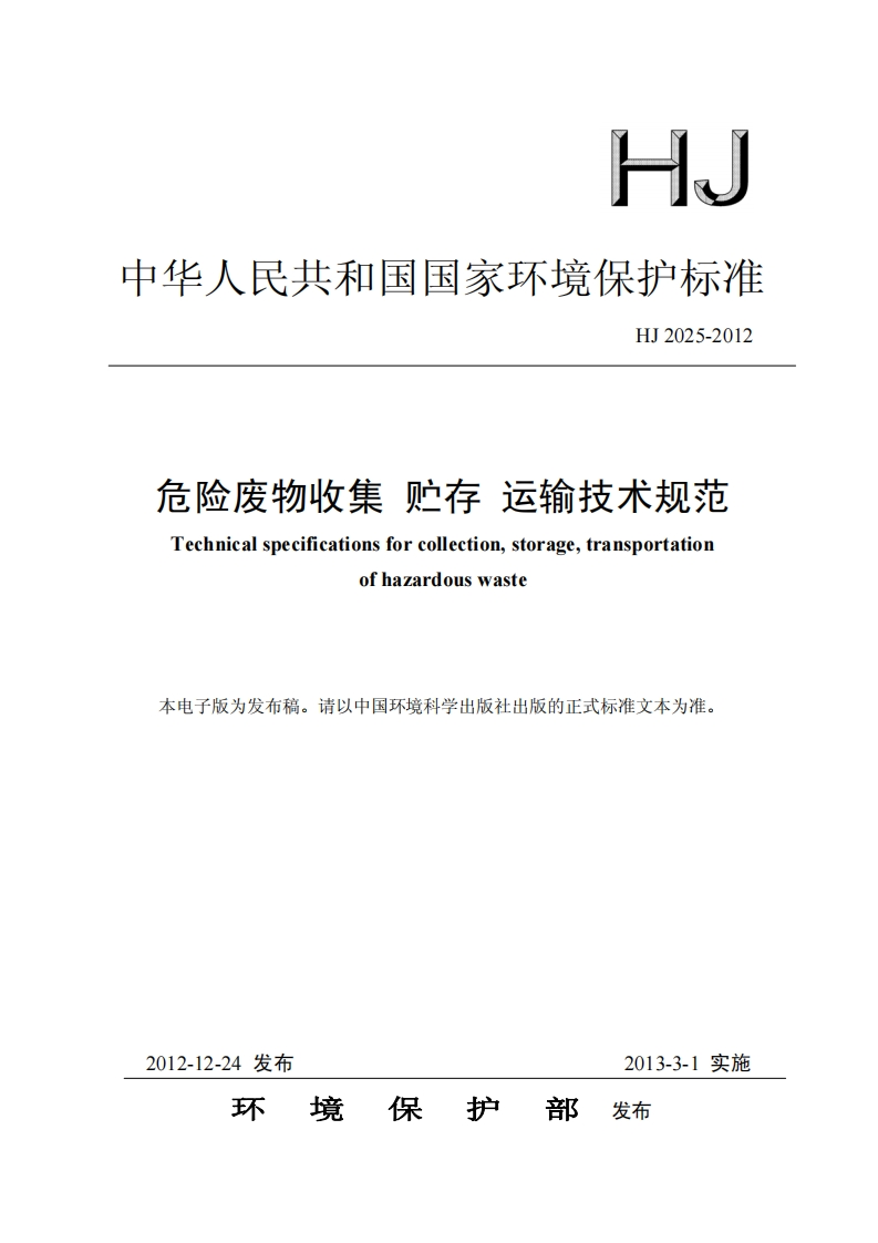 HJ中华人民共和国国家环境保护标准HJ2025-2012危险废物收集贮存运输技术规范Technical specifications for collection,storage,transportationof hazardous waste本电子版为发布稿。请以中国环境科学出版社出版的正式标准文本为准。2012-12-24发布2013-3-1实施环境保护部发布