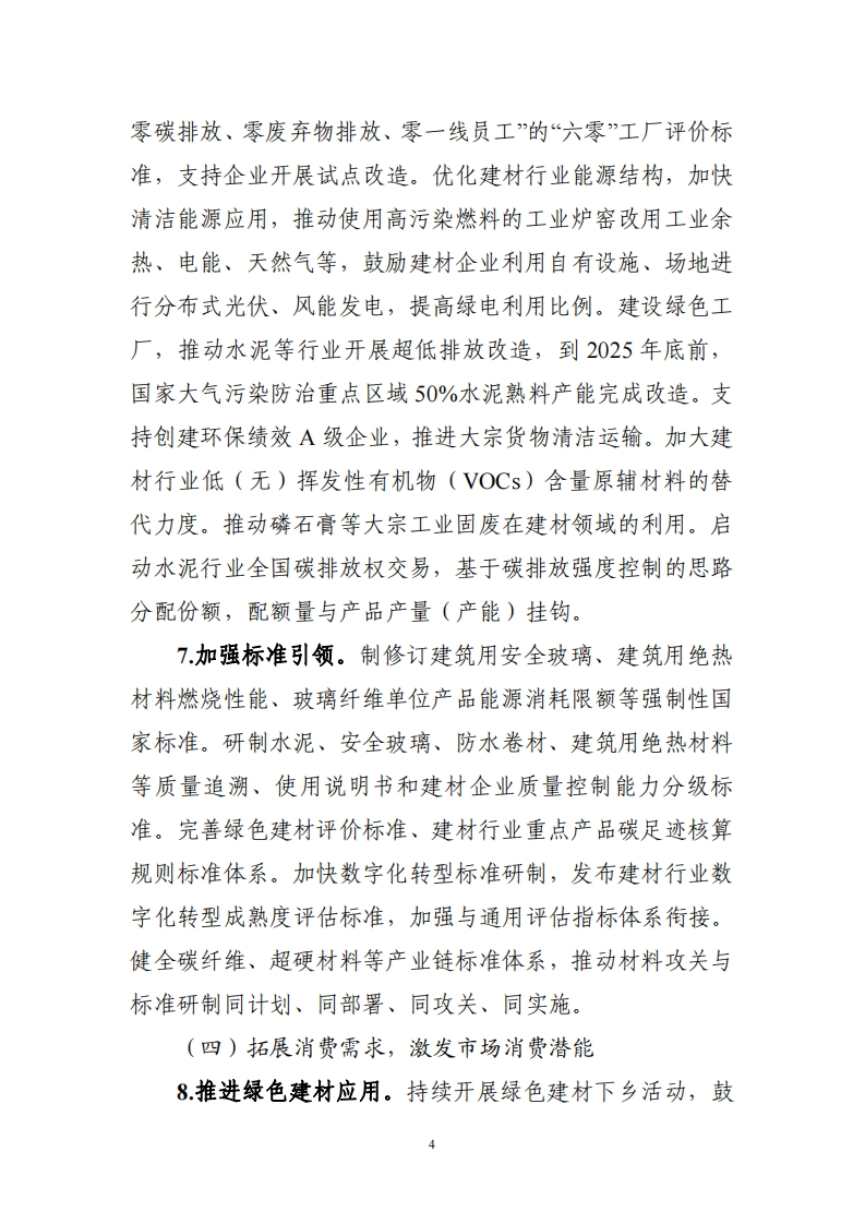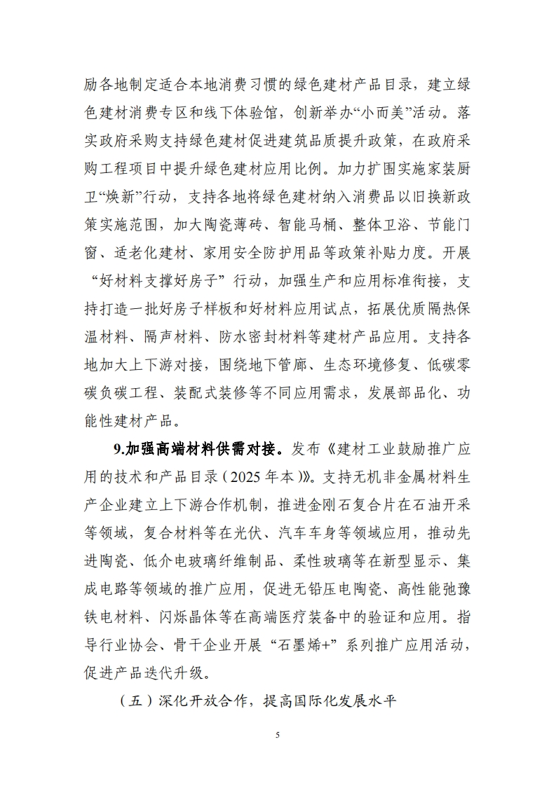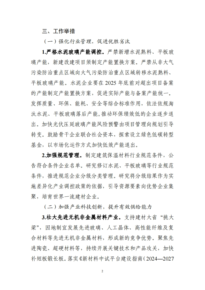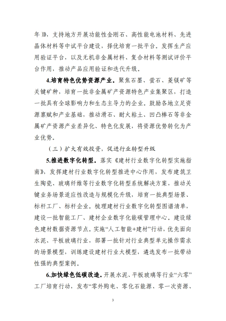 建材行业稳增长工作方案(2025一2026年)建材行业是国民经济的重要基础产业,是改善人居环境、发展循环经济的重要支撑,是工业经济稳增长的重要力量。当前,建材行业市场需求不振,结构性问题突出,行业稳增长任务艰巨。为贯彻落实中央经济工作会议精神,促进建材行业平稳运行和结构优化升级,制定本工作方案。一、总体要求以习近平新时代中国特色社会主义思想为指导,全面贯彻党的二十大和二十届二中、三中全会精神,坚持稳中求进工作总基调,以质量效益为中心,强化科技创新和产业创新深度融合,注重供需两端协同发力,以严禁新增产能和开展风险预警控总量,以传统建筑材料升级和先进无机非金属材料发展优供给,以数字化、绿色化改造促转型,以挖掘传统消费潜力和培育新兴应用扩需求,加快培育新质生产力,进一步提高产业链韧性和安全水平,实现质的有效提升和量的合理增长。二、主要目标2025一2026年,建材行业恢复向好,盈利水平有效提升,产业科技创新能力不断增强,绿色建材、先进无机非金属材料产业规模持续增长,其中2026年绿色建材营业收入超过3000亿元,绿色低碳和数字化发展水平明显提高。