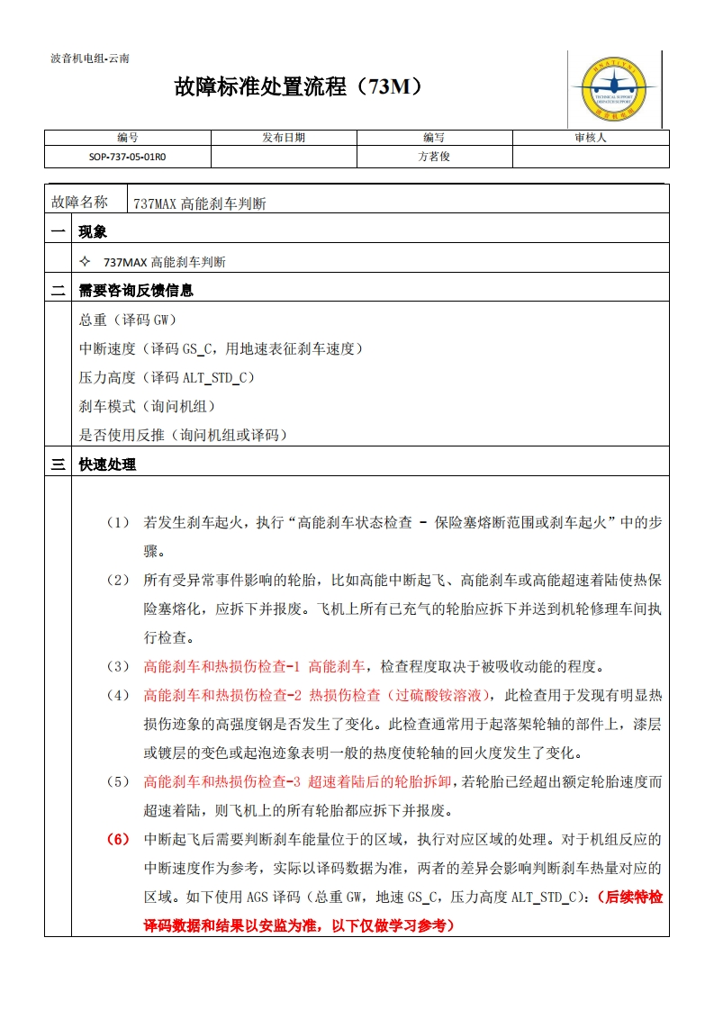 波音机电组云南故障标准处置流程(73M)编号发布日期编写审核人S0P.737-05-01R0方茗俊故障名称737MAX高能刹车判断现象令737MAX高能刹车判断二需要咨询反债信息总重(译码GW)中断速度(译码GSC,用地速表征刹车速度)压力高度(译码ALT_STD_.C)刹车模式(询问机组)是否使用反推(询问机组或译码)三快速处理(1)若发生刹车起火,执行“高能刹车状态检查一保险塞熔断范围或刹车起火”中的步骤。(2)所有受异常事件影响的轮胎,比如高能中断起飞、高能刹车或高能超速着陆使热保险塞熔化,应拆下并报废。飞机上所有已充气的轮胎应拆下并送到机轮修理车间执行检查。(3)高能刹车和热损伤检查-1高能刹车,检查程度取决于被吸收动能的程度。(4)高能刹车和热损伤检查-2热损伤检查(过硫酸铵溶液),此检查用于发现有明显热损伤迹象的高强度钢是否发生了变化。此检查通常用于起落架轮轴的部件上,漆层或镀层的变色或起泡迹象表明一般的热度使轮轴的回火度发生了变化。(5)高能刹车和热损伤检查-3超速着陆后的轮胎拆卸,若轮胎已经超出额定轮胎速度而超速着陆,则飞机上的所有轮胎都应拆下并报废。(6)中断起飞后需要判断刹车能量位于的区域,执行对应区域的处理。对于机组反应的中断速度作为参考,实际以译码数据为准,两者的差异会影响判断刹车热量对应的区域。如下使用AGS译码(总重GW,地速GSC,压力高度ALT_STD_C):(后续特检译码数据和结果以安监为准,以下仅做学习参考)