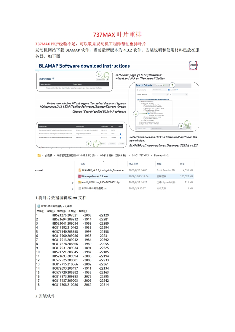 737MAX叶片重排737MAX维护经验不足,可以联系发动机工程师帮忙重排叶片发动机网站下载BLAMAP软件,当前最新版本为4.3.2软件、安装说明和使用材料已放在服务器,如下图BLAMAP Software download instructionsIn the main page.go to myDownload"widget and click on "New search"buttonSearch Criteria2服为司On the new window.fill out engine then select document type asMaintenance/ALL LEAP/Tooling Softwares/Blamap/Current VersionClick on "Search"to find BLAMAP software84Select both files and click on "Download"button on thenew window.BLAMAP software version on December 2022 is v4.3.2□,此比电脑)雄榜营理室服务器01042.2.21)亿码》05-技术资科(仅供参考),01-01-737MAX》Blamap-4.3.2名称修改日期炎型大小rsonalBLAMAP v4.3.2 tool-guide Decembe_2023/8/13 14:06Foxit Reader PD..4531KBBlamap-Awuto-4.3.2.exe2022/10/2517:04应用程序123.528KBconfigLEAPLine_956A7671G02zip2023/8/131427压第zipped文件711K8日LEAP.1B叶片动量矩,bt2023/5/915:37文本文档1KB1将叶片数据编辑成.txt文档门EAP-1B叶片动量矩-记事本文件旧编湖E格式Q)查看山帮山HB521276207821-2009-2212912HB521694209212-1914-222813HB521041209034-198922289HC817892210462-1935223945HC577140208558-1997-221586HC817900209086-1937-22231HC817913209942-1984-223928HC817678208666-1980-220559HC817931209634-1891-2232510HB521721208045-1987-2218511HB521693209594-2008-2219412HC577525209601-2008-2223313HC817715210066-2002-2236114HC872693208497-1911-2213415HC577720208582-1938-2216316HC817973209993-2073-2229517HC817437209003-20052224218HC817808210086-2062-223142.安装软件
