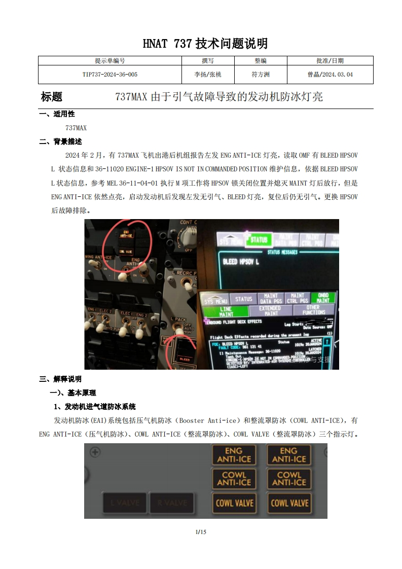 NAT737技术问题说明提示单编号撰写整编批准/日期TIP737-2024-36-005李扬/张桃符方洲曾品/2024.03.04标题737MAX由于引气故障导致的发动机防冰灯亮一、适用性737MAX二、背景描述2024年2月,有737MAX飞机出港后机组报告左发ENG ANTI--ICE灯亮,读取ONMF有BLEED HPSOVL状态信息和36-11020 ENGINE-1 HPSOV IS NOT IN COMMANDED POSITION维护信息,依据BLEED HPSOVL状态信总,参考MEL36-11-O4-01执行M项工作将HPSOV锁关闭位置并熄灭MAINT灯后放行,但是ENG ANTI-ICE依然点亮,启动发动机后发现左发无引气、BLEED灯亮,复位后仍无引气。更换HPSOV后故障排除。CONTTAL RECIRC FSYS HENUSTATUSLINEEXTENDEDHAINTBOUND FLIGHT DECX EFFECTS46-1102三、解释说明一)、基本原理1、发动机进气道防冰系统发动机防冰(EAI)系统包括压气机防冰(Booster Anti-ice)和整流罩防冰(COWL ANTI--ICE),有ENG ANTI--ICE(压气机防冰)、COWL ANTI--ICE(整流罩防冰)、COWL VALVE(整流罩防冰)三个指示灯。ENGENGANTI-ICEANTI-ICECOWLCOWLANTI-ICEANTI-ICEL VALVER VALVECOWL VALVECOWL VALVE1/15