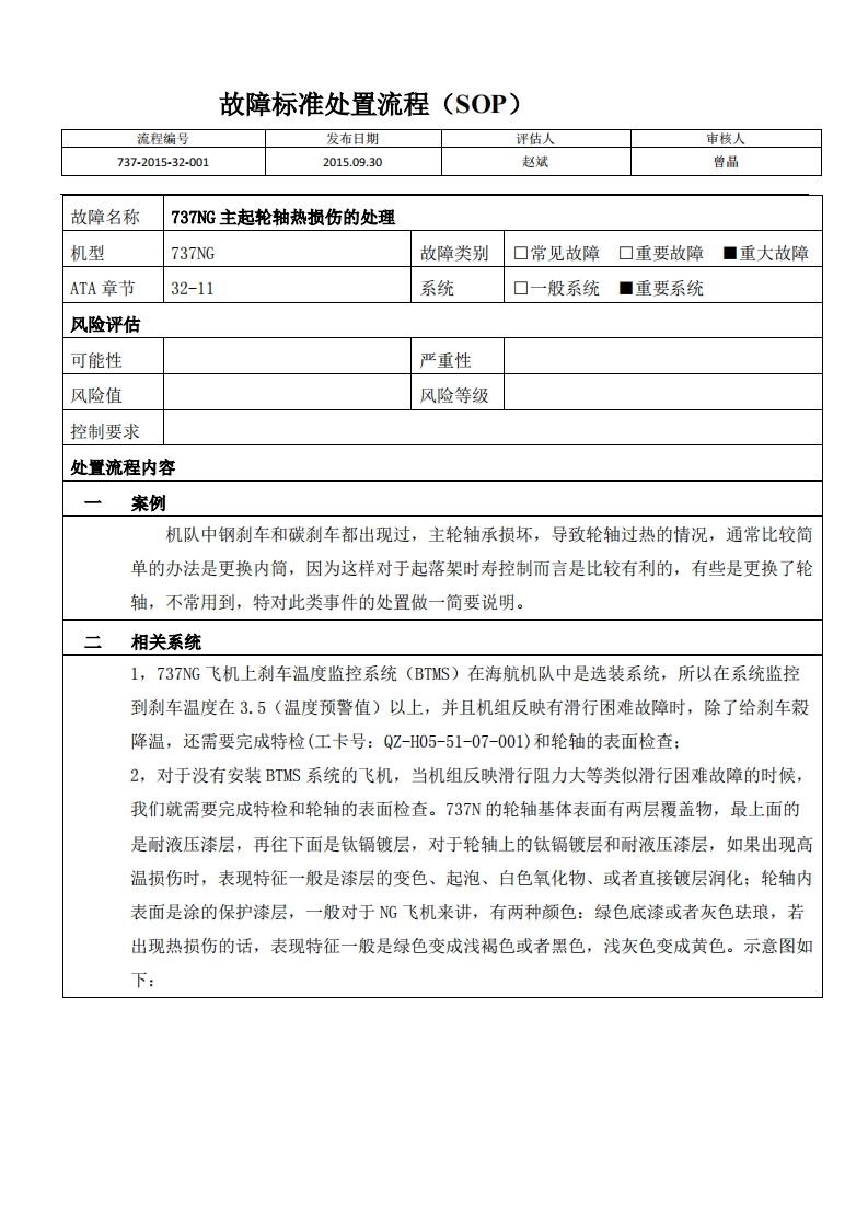 故障标准处置流程(SOP)流程编号发布日期评估人审核人737-2015-32-0012015.09.30赵斌曾品故障名称737NG主起轮轴热损伤的处理机型737NG故障类别口常见故障口重要故障■重大故障ATA章节32-11系统口一般系统■重要系统风险评估可能性严重性风险值风险等级控制要求处置流程内容一案例机队中钢刹车和碳刹车都出现过,主轮轴承损坏,导致轮轴过热的情况,通常比较简单的办法是更换内简,因为这样对于起落架时寿控制而言是比较有利的,有些是更换了轮轴,不常用到,特对此类事件的处置做一简要说明。二相关系统1,737NG飞机上刹车温度监控系统(BTMS)在海航机队中是选装系统,所以在系统监控到刹车温度在3.5(温度预警值)以上,并且机组反映有滑行困难故障时,除了给刹车榖降温,还需要完成特检(工卡号:QZ-H05-51-07-001)和轮轴的表面检查:2,对于没有安装BTMS系统的飞机,当机组反映滑行阻力大等类似滑行困难故障的时候,我们就需要完成特检和轮轴的表面检查。737N的轮轴基体表面有两层覆盖物,最上面的是耐液压漆层,再往下面是钛镉镀层,对于轮轴上的钛镉镀层和耐液压漆层,如果出现高温损伤时,表现特征一般是漆层的变色、起泡、白色氧化物、或者直接镀层润化:轮轴内表面是涂的保护漆层,一般对于NG飞机来讲,有两种颜色:绿色底漆或者灰色珐琅,若出现热损伤的话,表现特征一般是绿色变成浅褐色或者黑色,浅灰色变成黄色。示意图如下: