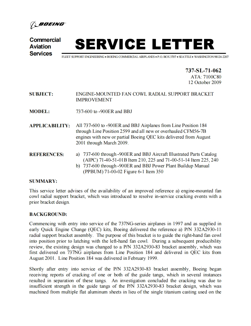 BOEINGCommercialAviationSERVICE LETTERServicesFLEET SUPPORT ENGINEERING.BOEING COMMERCIAL AIRPLANES.P.O.BOX3707.SEATILE.WASHINGTON98124-2207737-SL-71-062ATA:7100C8012 October 2009SUBJECT:ENGINE-MOUNTED FAN COWL RADIAL SUPPORT BRACKETIMPROVEMENTMODEL:737-600 to -900ER and BBJAPPLICABILITY:All 737-600 to -900ER and BBJ Airplanes from Line Position 184through Line Position 2599 and all new or overhauled CFM56-7Bengines with new or partial Boeing QEC kits delivered from August2001 through March 2009.REFERENCES:a)737-600 through-900ER and BBJ Aircraft Illustrated Parts Catalog(AIPC)71-40-51-01 B Item210,225and71-00-51-14Item225,240b)737-600 through-900ER and BBJ Power Plant Buildup Manual(PPBUM)71-00-02 Figure 6-1 Item 350SUMMARY:This service letter advises of the availability of an improved reference a)engine-mounted fancowl radial support bracket,which was introduced to resolve in-service cracking events with aprior bracket design.BACKGROUND:Commencing with entry into service of the 737NG-series airplanes in 1997 and as supplied inearly Quick Engine Change (QEC)kits,Boeing delivered the reference a)P/N 332A2930-11radial support bracket assembly.The purpose of this bracket is to guide the right-hand fan cowlinto position prior to latching with the left-hand fan cowl.During a subsequent producibilityreview,the existing design was changed to a P/N 332A2930-83 bracket assembly,which wasfirst delivered on 737NG airplanes from Line Position 184 and delivered in QEC kits fromAugust 2001.Line Position 184 was delivered in February 1999.Shortly after entry into service of the P/N 332A2930-83 bracket assembly,Boeing beganreceiving reports of cracking of one or both of the guide tangs,which in several instancesresulted in separation of these tangs.An investigation concluded the cracking was due toinsufficient strength in the guide tangs of the P/N 332A2930-83 bracket design,which wasmachined from multiple flat aluminum sheets in lieu of the single titanium casting used on the