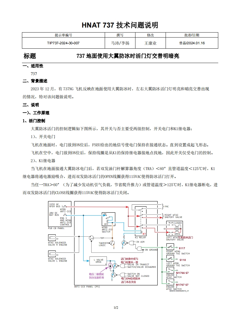 HNAT737技术问题说明提示单编号撰写修政批准/日期TIP737-2024-30-007马沛/李扬王康业曾品2024.01.16标题737地面使用大翼防冰时活门灯交替明暗亮一、适用性737二、背景描述2023年12月,有737NG飞机反映在地面使用大翼防冰时,左右大翼防冰活门灯明亮和暗亮交替出现的情况,特对该问题做说明。三、说明一)、工作原理1、活门控制大翼防冰活门的控制逻辑如下图所示,其开关与否主要受两级控制,开关电门和K1继电器:1)、开关电门飞机在地面时,电门放到ON位后,SEU给出的地信号使电门保持在接通状态。直到设置成起飞形态。飞机在空中,电门放到O位后,保持线圈是从K1的保持继电器接地点找地,因此开关仅受电门的控制。2)、K1继电器当飞机在地面接通大翼防冰电门后,若双发油门杆解算器角度(TRA)<60°且管道温度<125℃时,K1继电器将通电激励吸合,进而双发防冰活门的OPEN线圈获得115VAC使得防冰活门打开。当任一TRA>60°(为了减少发动机引气负载,节省爬升推力)或管道温度>125℃时,K1继电器断电,进而双发防冰活门的CLOSE线圈获得115VAC使得防冰活门关闭.51ANTI-ICESNDTALVEP18 CB PANELK1。。OPEK1 RELAYo蓝冰活VALVE RENINE5117RIGHT WINGGROUND TAI SWITCH¥0活门转换中或与5118CCUNTA SWITCH稳正二极管起M176657到分压的作用CLOSED电门ON位威防冰活们不在关位M1767s7TI-ICE PANEL(PS】1/2