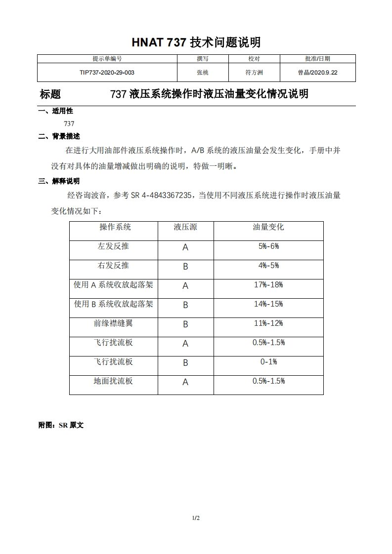 HNAT737技术问题说明提示单编号撰写校对批准/旧期T1P737-2020-29-003张桃符方洲曾品2020.9.22标题737液压系统操作时液压油量变化情况说明一、适用性737二、背景描述在进行大用油部件液压系统操作时,AB系统的液压油量会发生变化,手册中并没有对具体的油量增减做出明确的说明,特做一明晰。三、解释说明经咨询波音,参考SR4-4843367235,当使用不同液压系统进行操作时液压油量变化情况如下:操作系统液压源油量变化左发反推A5%-6%右发反推B4%-5%使用A系统收放起落架A17%-18%使用B系统收放起落架B14%-15%前缘襟缝翼B11%-12%飞行扰流板0.5%-1.5%飞行扰流板B0-1%地面扰流板A0.5%-1.5%附图:SR原文1/2