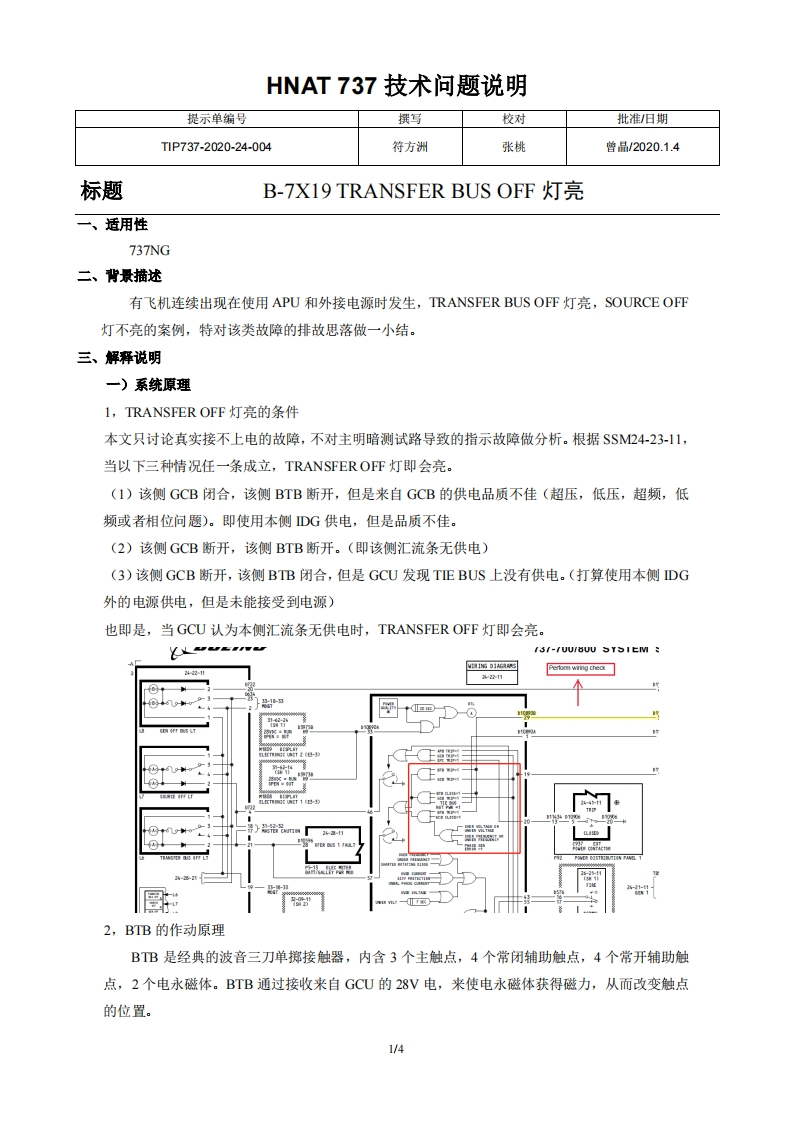 HNAT737技术问题说明提示单编号撰写校对批准/旧期T1P737-2020-24-004符方洲张桃曾品/2020.1.4标题B-7XI9 TRANSFER BUS OFF灯亮一、适用性737NG二、背景描述有飞机连续出现在使用APU和外接电源时发生,TRANSFER BUS OFF灯亮,SOURCE OFF灯不亮的案例,特对该类故障的排故思落做一小结。三、解释说明一)系统原理1,TRANSFER OFF灯亮的条件本文只讨论真实接不上电的故障,不对主明暗测试路导致的指示故障做分析。根据SSM24-23-11,当以下三种情况任一条成立,TRANSFER OFF灯即会亮。(1)该侧GCB闭合,该侧BTB断开,但是来自GCB的供电品质不佳(超压,低压,超频,低频或者相位问题)。即使用本侧DG供电,但是品质不佳。(2)该侧GCB断开,该侧BTB断开。(即该侧汇流条无供电)(3)该侧GCB断开,该侧BTB闭合,但是GCU发现TIE BUS上没有供电。(打算使用本侧DG外的电源供电,但是未能接受到电源)也即是,当GCU认为本侧汇流条无供电时,TRANSFER OFF灯即会亮。/3/-/UUIBUU STSIEMMWt镜1w脑D1AG芯2422-1Perom wirng cheo还1122-器…哥1e24-2-12,BTB的作动原理BB是经典的波音三刀单掷接触器,内含3个主触点,4个常闭辅助触点,4个常开辅助触点,2个电永磁体。BTB通过接收来自GCU的28V电,来使电永磁体获得磁力,从而改变触点的位置。1/4