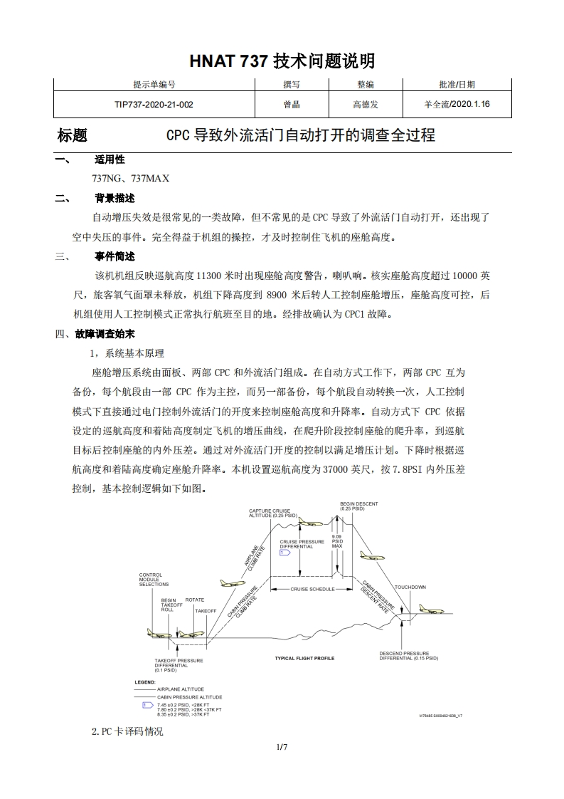 HNAT737技术问题说明提示单编号撰写整编批准/日期T1P737-2020-21-002曾品高德发羊全流2020.1.16标题CPC导致外流活门自动打开的调查全过程适用性737NG、737MAX二、背景描述自动增压失效是很常见的一类故障,但不常见的是CP℃导致了外流活门自动打开,还出现了空中失压的事件。完全得益于机组的操控,才及时控制住飞机的座舱高度。三、事件简述该机机组反映巡航高度11300米时出现座舱高度警告,喇叭响。核实座舱高度超过10000英尺,旅客氧气面罩未释放,机组下降高度到8900米后转人工控制座舱增压,座舱高度可控,后机组使用人工控制模式正常执行航班至目的地。经排故确认为CPC1故障。四、故障调查始末1,系统基本原理座舱增压系统由面板、两部CPC和外流活门组成。在自动方式工作下,两部CPC互为备份,每个航段由一部CC作为主控,而另一部备份,每个航段自动转换一次,人工控制模式下直接通过电门控制外流活门的开度来控制座舱高度和升降率。自动方式下CC依据设定的巡航高度和着陆高度制定飞机的增压曲线,在爬升阶段控制座舱的爬升率,到巡航目标后控制座舱的内外压差。通过对外流活门开度的控制以满足增压计划。下降时根据巡航高度和着陆高度确定座舱升降率。本机设置巡航高度为37000英尺,按7.8PSI内外压差控制,基本控制逻辑如下如图。LTUDE025DECENT1)CRUISE SCHEDULEOUCHDODFERENTALLEGEND:一AIRPLANE ALTITUCE-CABIN PRESSURE ALTITUDE7045CC0421M装V2.P℃卡译码情况1/7
