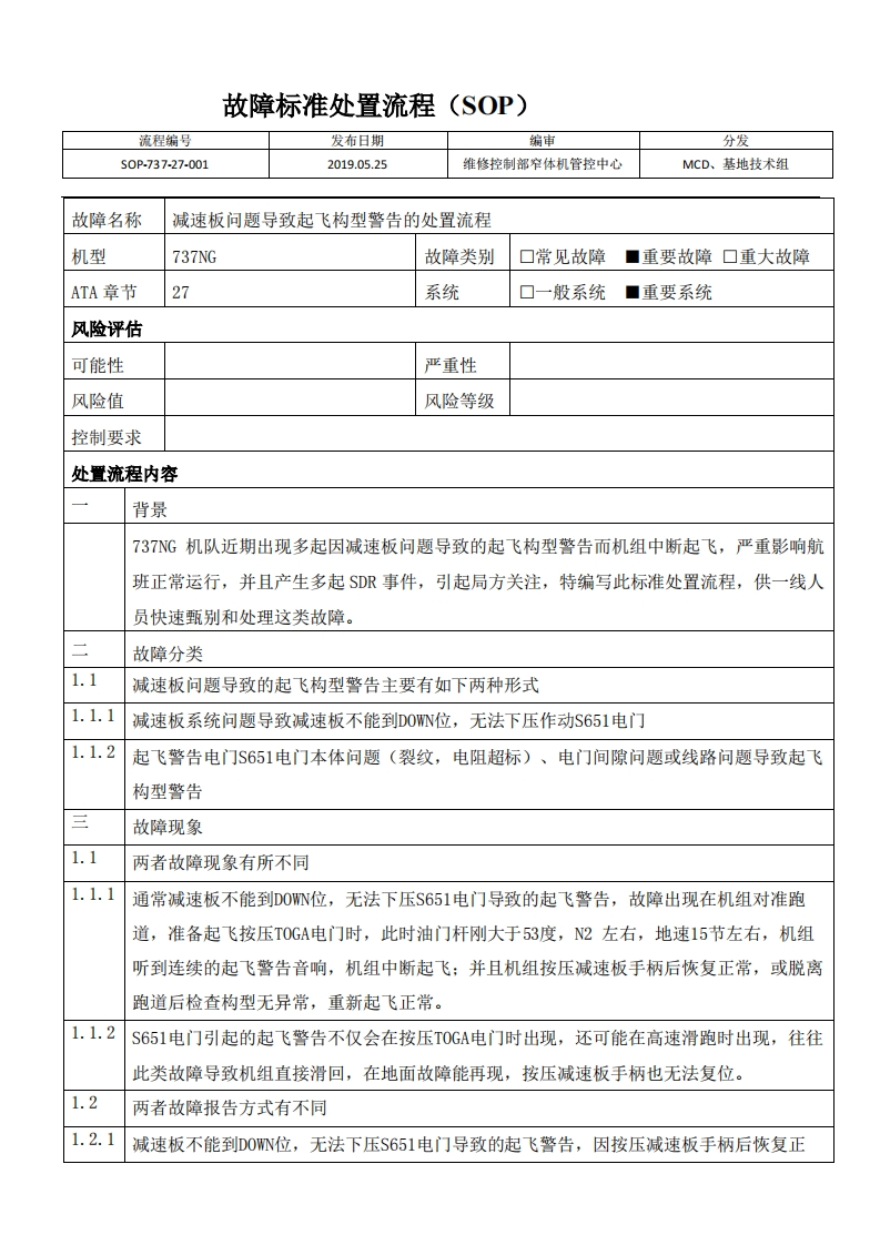 故障标准处置流程(SOP)流程编号发布日期编审分发S0P-737-27-0012019.05.25维修控制部窄体机管控中心MCD、基地技术组故障名称减速板问题导致起飞构型警告的处置流程机型737NG故障类别口常见故障■重要故障口重大故障ATA章节27系统口一般系统■重要系统风险评估可能性严重性风险值风险等级控制要求处置流程内容背景737NG机队近期出现多起因减速板问题导致的起飞构型警告而机组中断起飞,严重影响航班正常运行,并且产生多起SD事件,引起局方关注,特编写此标准处置流程,供一线人员快速甄别和处理这类故障。二故障分类1.1减速板问题导致的起飞构型警告主要有如下两种形式1.1.1减速板系统问题导致减速板不能到D0WmN位,无法下压作动S651电门1.1.2起飞警告电门S651电门本体问题(裂纹,电阻超标)、电门间隙问题或线路问题导致起飞构型警告三故障现象1.1两者故障现象有所不同1.1.1通常减速板不能到D0N位,无法下压S651电门导致的起飞警告,故障出现在机组对准跑道,准备起飞按压T0GA电门时,此时油门杆刚大于53度,2左右,地速15节左右,机组听到连续的起飞警告音响,机组中断起飞:并且机组按压减速板手柄后恢复正常,或脱离跑道后检查构型无异常,重新起飞正常。1.1.2S651电门引起的起飞警告不仅会在按压T0GA电门时出现,还可能在高速滑跑时出现,往往此类故障导致机组直接滑回,在地面故障能再现,按压减速板手柄也无法复位。1.2两者故障报告方式有不同1.2.1减速板不能到D0N位,无法下压S651电门导致的起飞警告,因按压减速板手柄后恢复正