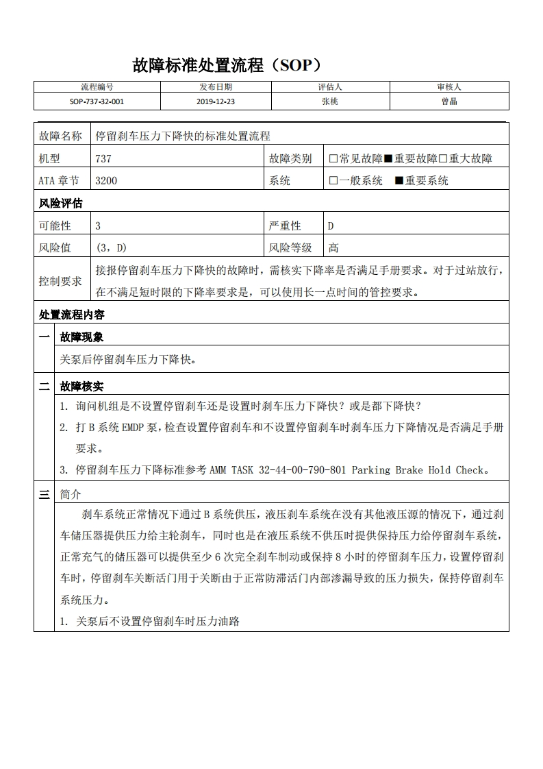 故障标准处置流程(SOP)流程编号发布日期评估人审核人S0P737-32-0012019-12-23张桃曾品故障名称停留刹车压力下降快的标准处置流程机型737故障类别口常见故障■重要故障口重大故障ATA章节3200系统口一般系统■重要系统风险评估可能性3严重性D风险值(3,D)风险等级高接报停留刹车压力下降快的故障时,需核实下降率是否满足手册要求。对于过站放行,控制要求在不满足短时限的下降率要求是,可以使用长一点时间的管控要求。处置流程内容故障现象关泵后停留刹车压力下降快。二故障核实1.询问机组是不设置停留刹车还是设置时刹车压力下降快?或是都下降快?2.打B系统EDP泵,检查设置停留刹车和不设置停留刹车时刹车压力下降情况是否满足手册要求。3.停留刹车压力下降标准参考AMM TASK32-44-00-790-801 Parking Brake Hold Check。三简介刹车系统正常情况下通过B系统供压,液压刹车系统在没有其他液压源的情况下,通过刹车储压器提供压力给主轮刹车,同时也是在液压系统不供压时提供保持压力给停留刹车系统,正常充气的储压器可以提供至少6次完全刹车制动或保持8小时的停留刹车压力,设置停留刹车时,停留刹车关断活门用于关断由于正常防滞活门内部渗漏导致的压力损失,保持停留刹车系统压力。1.关泵后不设置停留刹车时压力油路
