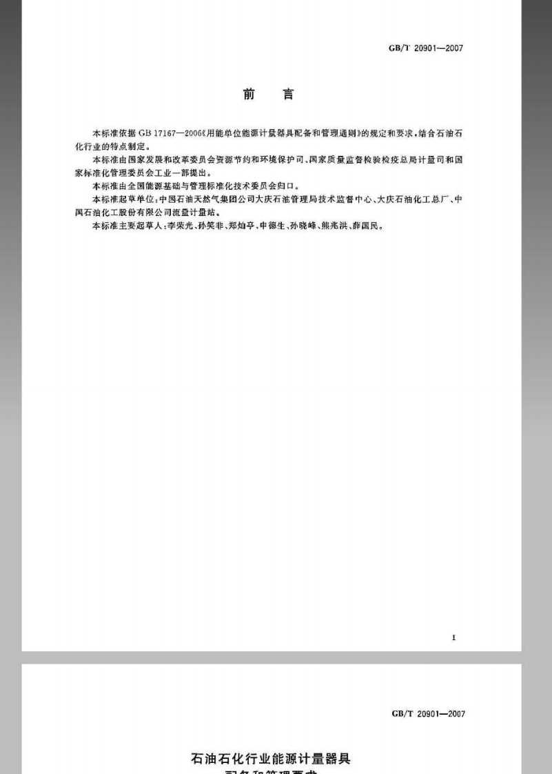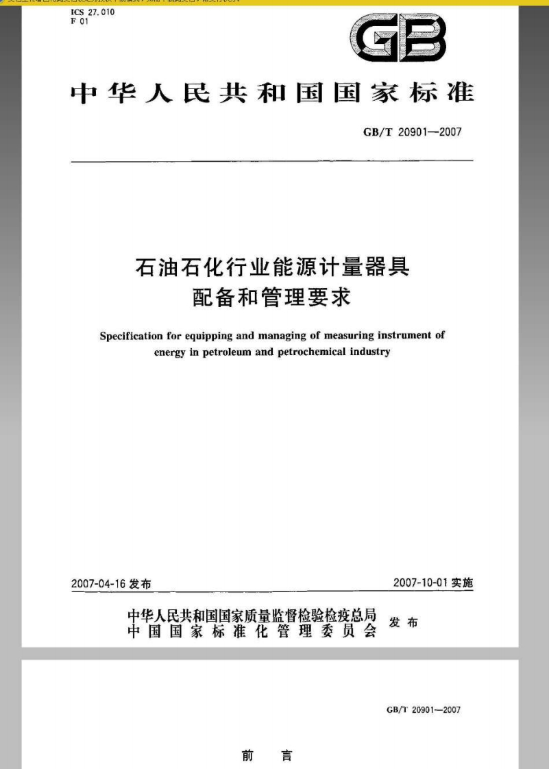 Cs27.010F01中华人民共和国国家标准GB/T20901一2007石油石化行业能源计量器具配备和管理要求Specification for equipping and managing of measuring instrument ofenergy in petroleum and petrochemical industry2007-04-16发布2007-10-01实施中华人民共和国国家质量监督检验检疫总局中国国家标准化管理委员会发布GB/T20901-2007前言