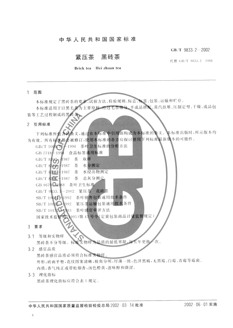 中华人民共和国强制性标准规范GB_T9833.2-2002紧压茶黑砖茶(新版现行)348072@abc1个月前发布关注私信0.63MB5页023中华人民共和国强制性标准规范GB_T9833.2-2002紧压茶黑砖茶(新版现行)此内容为付费资源,请付费后查看¥23¥32黄金会员免费钻石会员免费立即购买您当前未登录!建议登陆后购买,可保存购买订单付费资源 第1页 / 共5页 第2页 / 共5页 第3页 / 共5页 第4页 / 共5页 试读已结束,还剩1页,您可下载完整版后进行离线阅读 THE END农学类标准规范餐饮美食 喜欢就支持一下吧收藏