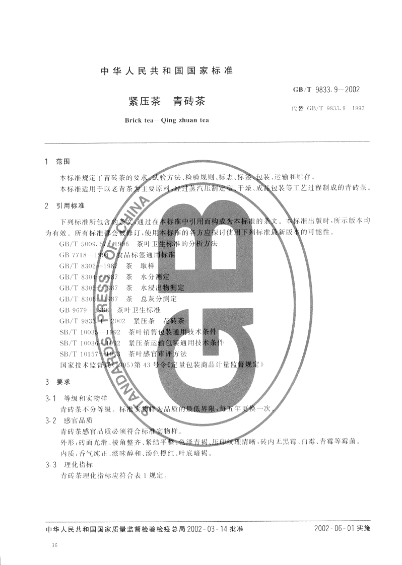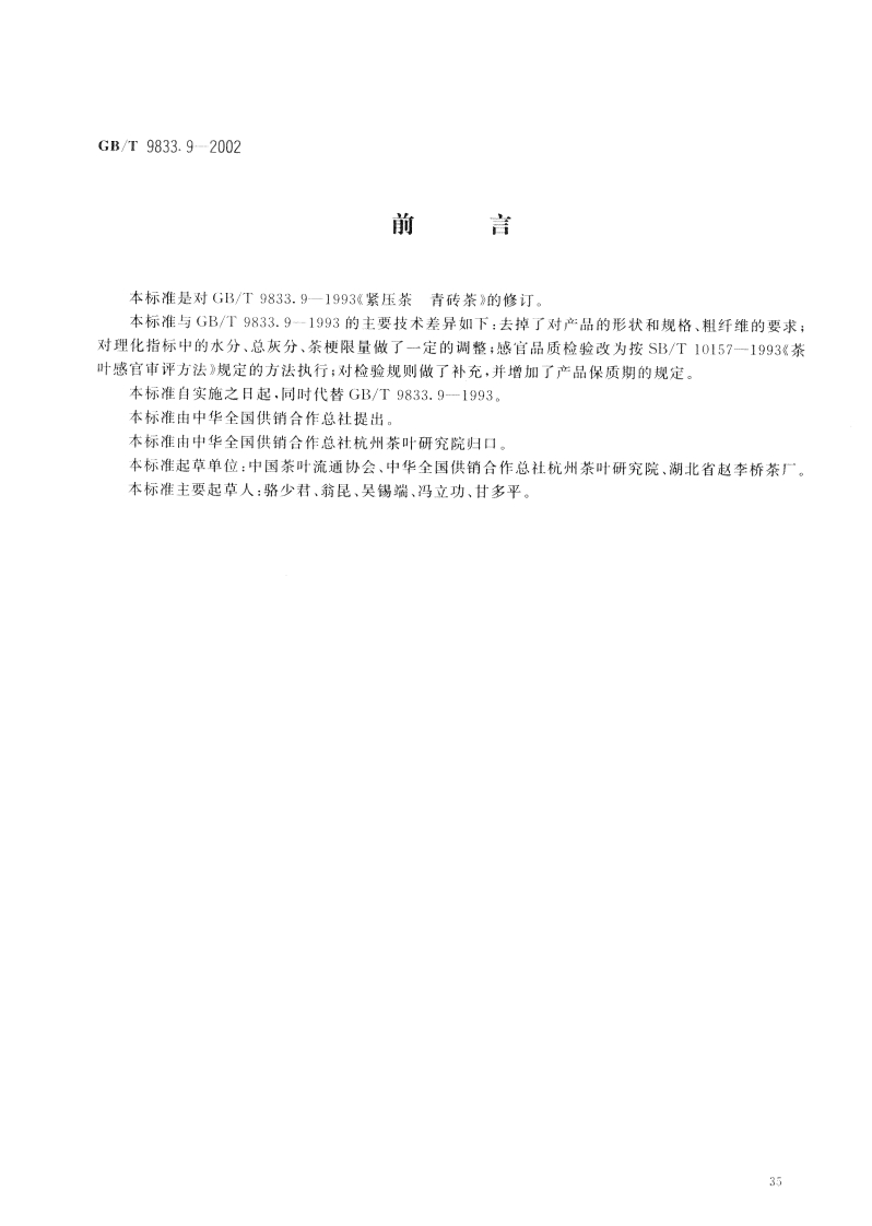中华人民共和国强制性标准规范GB_T9833.9-2002紧压茶青砖茶(新版现行)348072@abc1个月前发布关注私信0.64MB5页035中华人民共和国强制性标准规范GB_T9833.9-2002紧压茶青砖茶(新版现行)此内容为付费资源,请付费后查看¥23¥32黄金会员免费钻石会员免费立即购买您当前未登录!建议登陆后购买,可保存购买订单付费资源 第1页 / 共5页 第2页 / 共5页 第3页 / 共5页 第4页 / 共5页 试读已结束,还剩1页,您可下载完整版后进行离线阅读 THE END农学类标准规范餐饮美食 喜欢就支持一下吧收藏