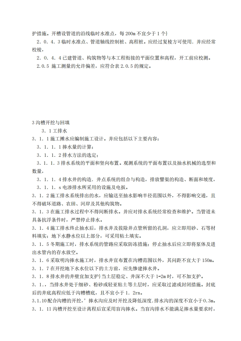 给水排水管道工程施工及验收规范1总则1.0.1为加强给水排水管道工程的施工管理.提高技术水平,确保工程质量,安全生产,节约材料,提高经济效益.特翩定本规范。1.0.2本规范适用于城镇和工业区的室外给水排水管道工程的施工及验收。1.0.3给水排水管道工程应按设计文件和施工图施工。变更设计应经过设计单位同意。1.0.4给水排水管道工程的管材、管道附件等材料.应符合国家现行的有关产品标准的规定,并应具有出厂合格证。用于生活饮用水的管道,其材质不得污染水质。1.0.5给水排水管道工程施工,应遵守国家和地方有关安全、劳动保护、防火、防爆、环境和文物保护等方面的规定。1.0.6给水排水管道工程施工及验收除应符合本规范规定外,尚应符合国家现行的有关标准、规范的规定。2施工准备2.0.1给水排水管道工程施工前应由设计单位进行设计交底。当施工单位发现施工图有错误时,应及时向设计单位挺出变更设计的要求。2.0.2给水排水管道工程施工前}应根据旌工需要进行调查研究,并应掌握管道沿线的下列情况和资料t2.0.2.1现场地形、地貌、建筑物各种臂线和其他设施的慵阮2.0.2.2工程地质和水文地质资料:2.0.2.3气象资料}2.0.2.4工程用地、交通运输及排水条件2.0.2.5施工供水、供电条件2.0.2.6工程材料、施工机械供应条件2.0.2.7在地表水水体中或岸边施工时,应掌握地表水的水文和航运资料。在寒冷地区施工时,尚应掌握地表水的冻结及漉冰的资料:2.0.2.0结合工程特点和现场条件的其他情况和资料。2.O.3给水排水管道工程施工前应编制施工组织设计。施工组织设计的内容,主要应包括工程概况、施工部署、施工方法、材料、主要机械设备的供应、保证施工质量、安全、工期、降低成本和提高经济效益的技术组织措施、施工计划、施工总平面图以及保护周围环境的措施等。对主要施工方法,尚应分别编制施工设计。2.0.4施工测量应符合下列规定t2.0.4.1施工前.建设单位应组织有关单位向施工单位进行现场交桩2.0.4.2临时水准点和管道轴线控制桩的设置应便于观测且必须牢固,并应采取保