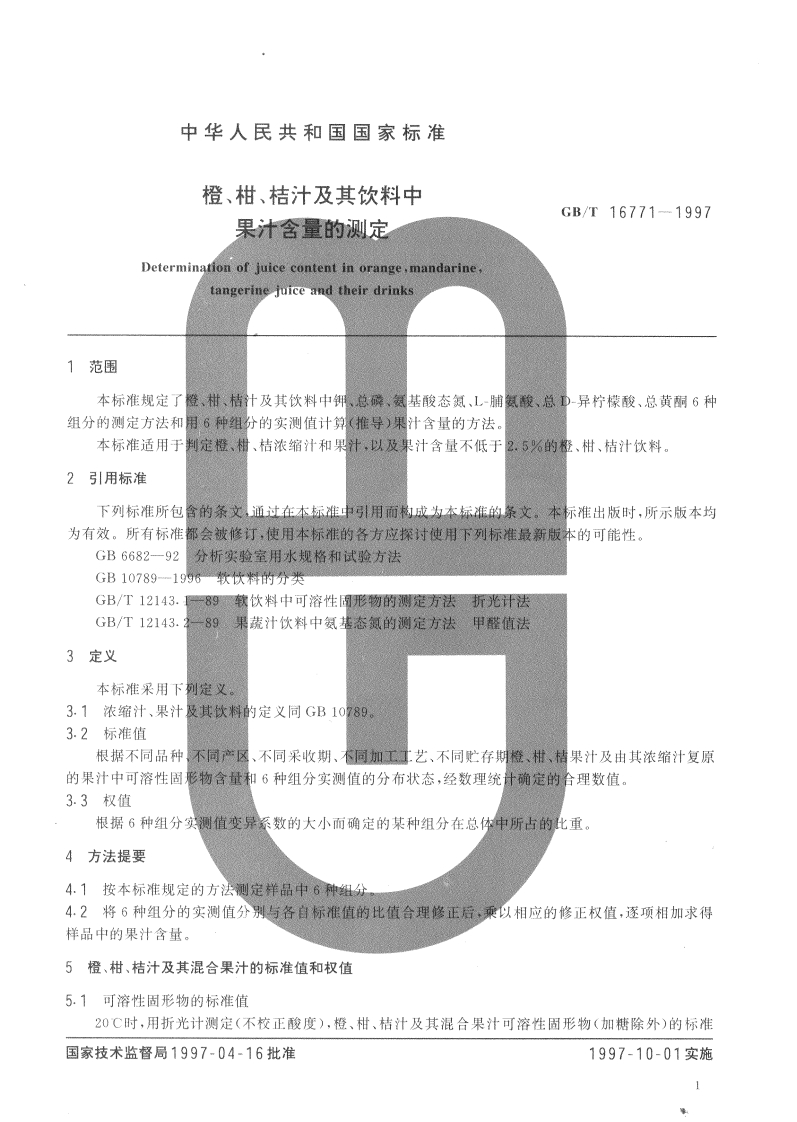 中华人民共和国强制性标准规范GB_T16771-1997橙、柑、桔汁及其饮料中果汁含量的标准测定(新版现行)348072@abc46天前发布关注私信4.69MB15页044中华人民共和国强制性标准规范GB_T16771-1997橙、柑、桔汁及其饮料中果汁含量的标准测定(新版现行)此内容为付费资源,请付费后查看¥13¥19黄金会员免费钻石会员免费立即购买您当前未登录!建议登陆后购买,可保存购买订单付费资源 第1页 / 共15页 第2页 / 共15页 第3页 / 共15页 第4页 / 共15页 试读已结束,还剩11页,您可下载完整版后进行离线阅读 THE END农学类标准规范餐饮美食 喜欢就支持一下吧收藏