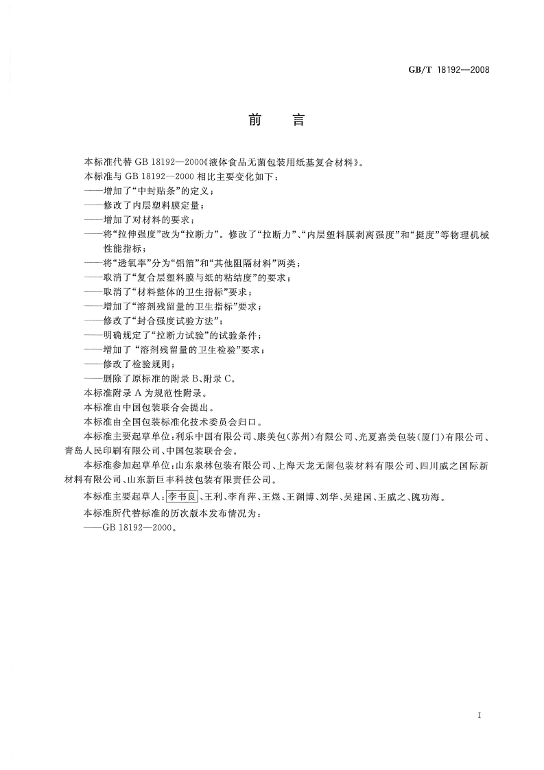 中华人民共和国强制性标准规范GB_T18192-2008液体食品无菌包装用纸基复合材料(新版现行)348072@abc1个月前发布关注私信1.26MB9页043中华人民共和国强制性标准规范GB_T18192-2008液体食品无菌包装用纸基复合材料(新版现行)此内容为付费资源,请付费后查看¥13¥19黄金会员免费钻石会员免费立即购买您当前未登录!建议登陆后购买,可保存购买订单付费资源 第1页 / 共9页 第2页 / 共9页 第3页 / 共9页 第4页 / 共9页 试读已结束,还剩5页,您可下载完整版后进行离线阅读 THE END农学类标准规范餐饮美食 喜欢就支持一下吧收藏