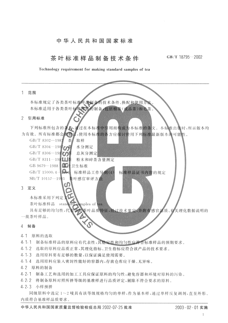 中华人民共和国强制性标准规范GB_T18795-2002茶叶标准样品制备技术条件(新版现行)348072@abc1个月前发布关注私信0.34MB4页033中华人民共和国强制性标准规范GB_T18795-2002茶叶标准样品制备技术条件(新版现行)此内容为付费资源,请付费后查看¥19¥23黄金会员免费钻石会员免费立即购买您当前未登录!建议登陆后购买,可保存购买订单付费资源 第1页 / 共4页 第2页 / 共4页 第3页 / 共4页 第4页 / 共4页 已完成全部阅读,共4页 THE END农学类标准规范餐饮美食 喜欢就支持一下吧收藏