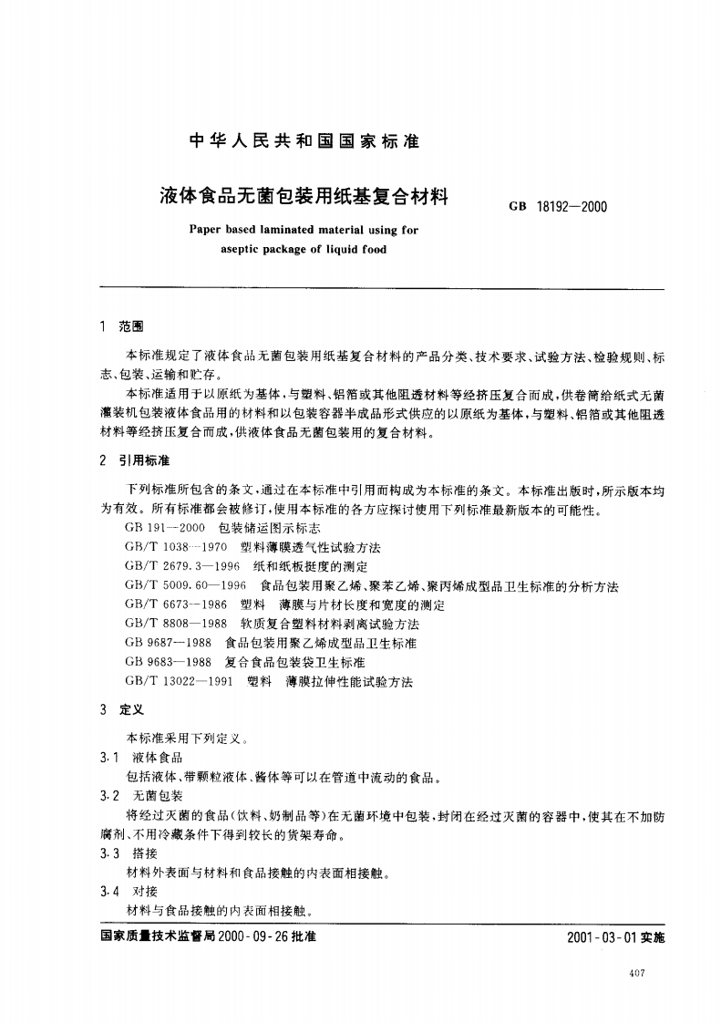 GB18192-2000液体食品无菌包装用纸基复合材料348072@abc1个月前发布关注私信0.26MB8页026GB18192-2000液体食品无菌包装用纸基复合材料此内容为付费资源,请付费后查看¥19¥26黄金会员免费钻石会员免费立即购买您当前未登录!建议登陆后购买,可保存购买订单付费资源 第1页 / 共8页 第2页 / 共8页 第3页 / 共8页 第4页 / 共8页 第5页 / 共8页 试读已结束,还剩3页,您可下载完整版后进行离线阅读 THE END播放器标准规范餐饮美食 喜欢就支持一下吧收藏
