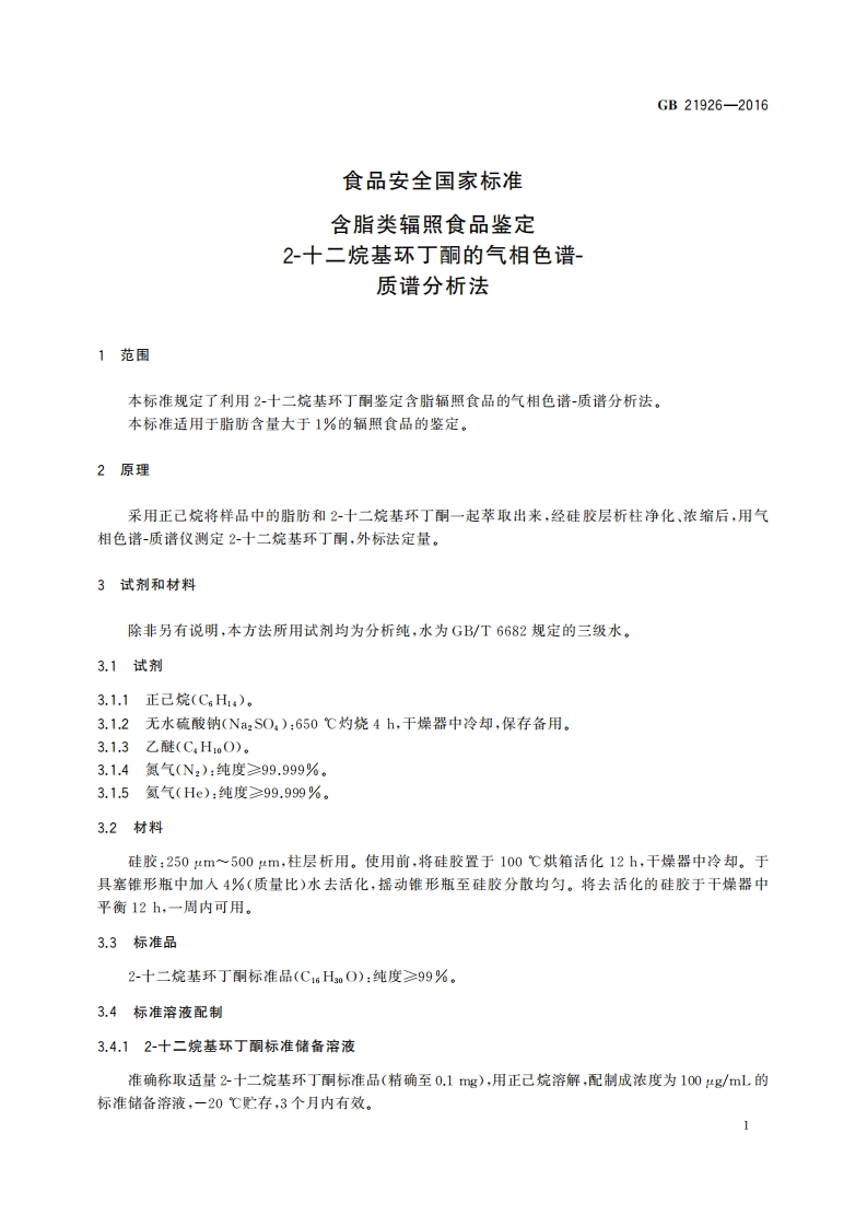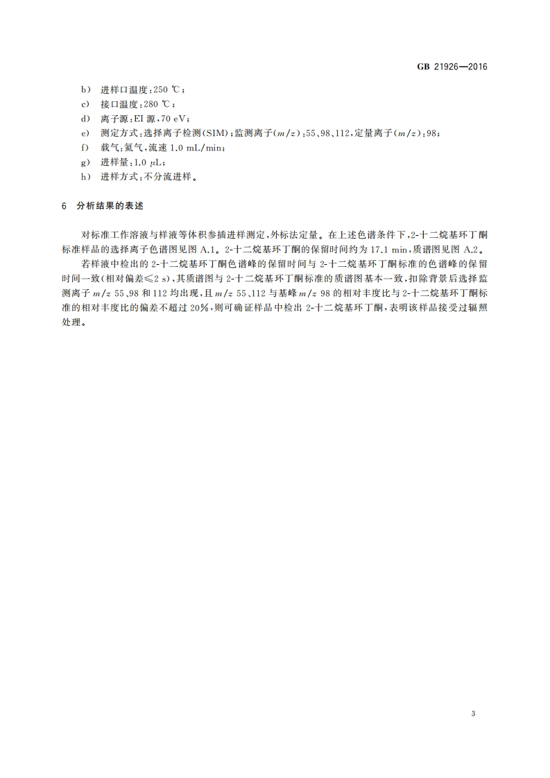 GB21926-2016食品安全国家强制性标准规范含脂类辐照食品鉴定2-十二烷基环丁酮的气相色谱-质谱分析法348072@abc1个月前发布关注私信0.25MB6页029GB21926-2016食品安全国家强制性标准规范含脂类辐照食品鉴定2-十二烷基环丁酮的气相色谱-质谱分析法此内容为付费资源,请付费后查看¥19¥26黄金会员免费钻石会员免费立即购买您当前未登录!建议登陆后购买,可保存购买订单付费资源 第1页 / 共6页 第2页 / 共6页 第3页 / 共6页 第4页 / 共6页 第5页 / 共6页 试读已结束,还剩1页,您可下载完整版后进行离线阅读 THE END农学类标准规范餐饮美食 喜欢就支持一下吧收藏